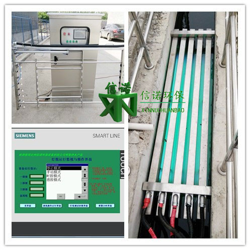 信諾明渠式紫外線系統消毒設備模塊安裝于開放式紫外消毒渠中,為了維修方便,配電柜及控制柜均安裝在水渠上方。紫外光燈管排架排列于明渠中,紫外燈管與水流方向一致平行排放!